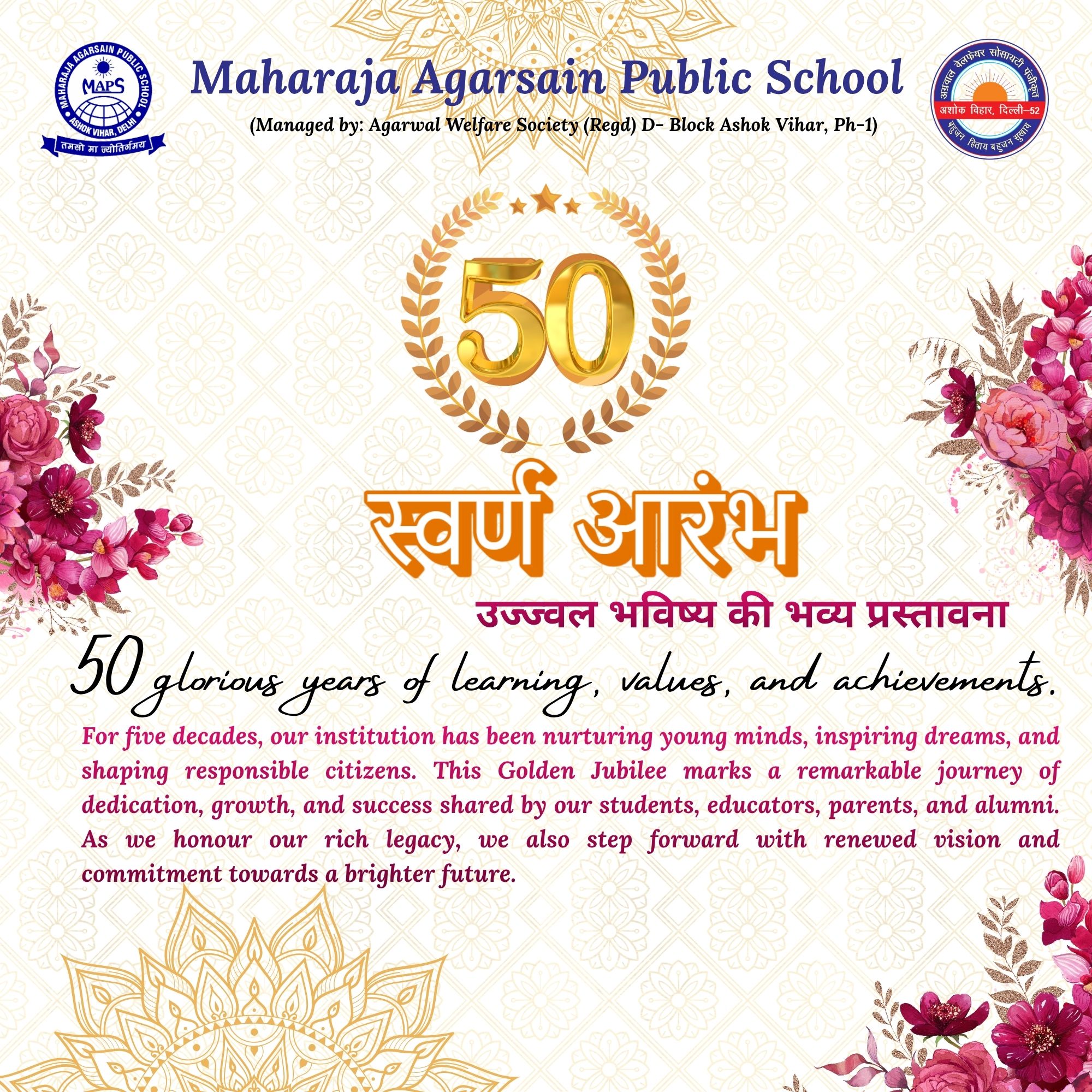 Nestled in the heart of our vibrant community, MAPS has been an anchor of educational excellence and personal growth for over 49 years. Driven by the profound belief that education holds the key to a brighter future, the worthy members of AWS sowed the seeds on 10th April 1978 in the memory of the great, Saint Maharaja Agarsain Ji (founder of the socialist democratic setup).MAPS is affiliated with CBSE and holds the distinction of being the first school in North Delhi registered with Cambridge Assessment International Education, University of Cambridge, U.K. Our commitment to academic diversity is evident in offering IGCSE and AS/A levels from primary to class X.