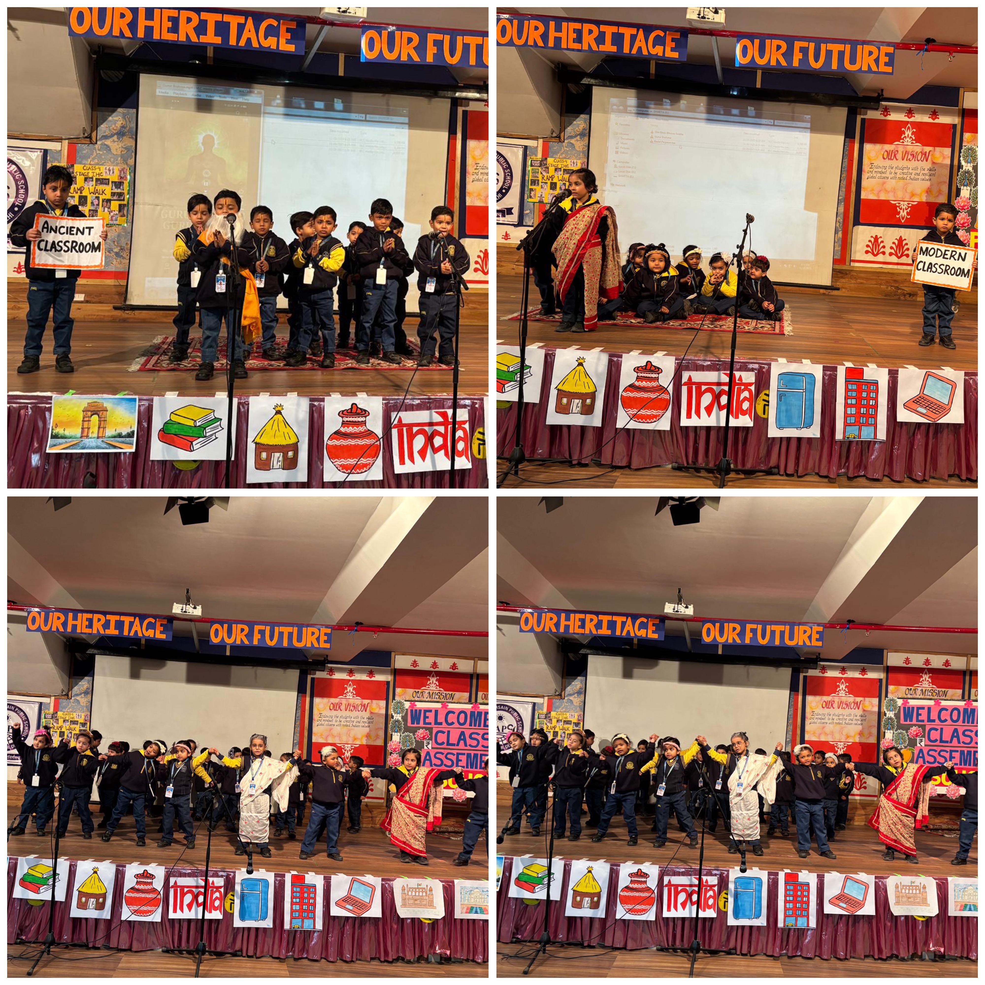 "OUR HERITAGE OUR FUTURE" is a slogan that emphasizes the connection between preserving the past and securing a prosperous future. It suggests that our cultural and historical heritage is a foundation for our identity and a guide for future generations. Young agarsainians of class Preschool-E presented the morning assembly on the Topic- Our Heritage Our Future. The presentation commenced with the Introduction, children played the role of grandmother and grandson in which they talked about the ancient classroom and the modern classroom and gave demonstrations about the ancient classroom and the modern classroom with the conclusion. The Finale dance on song – Baadal par paon hai added more joy and enjoyment to the event. This event successfully highlighted the timeless charm of cultural heritage while creating a memorable experience for all.