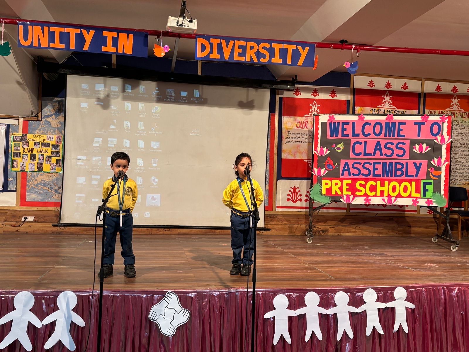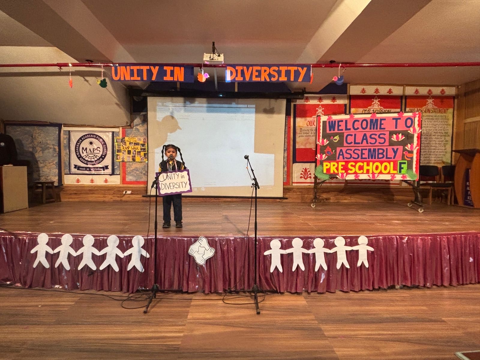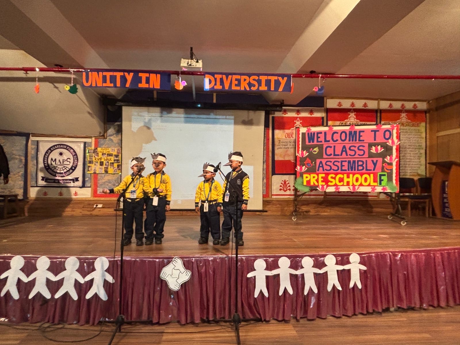 Students of class Preschool-F presented morning assembly onthe topic ’UNITY IN DIVERSITY’. The event commenced with the prayer followed by thought of the day by the students. Our preschoolers performed a short skit where they depicted the importance of working together in unity. Our tiny tots enthusiastically participated in a scintillating dance performance on the song ‘ek chidiya’ and ‘Aao hum sab hath milayein’. Then few questions were asked from the students related to the theme. The assembly was applauded by one and all.